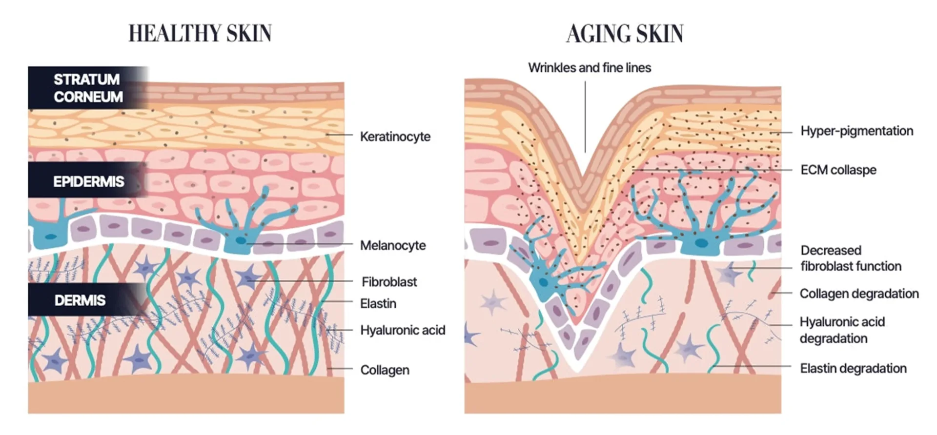 เมื่ออายุมากขึ้น ECM จะเสื่อมสภาพตามธรรมชาติ เช่น คอลลาเจนลดลงการผลัดเซลล์ช้าลง การฟื้นฟู ECM จึงเป็นทางหนึ่งที่ช่วยให้ผิวอ่อนเยาว์ กระชับ และกระจ่างใสขึ้นได้อย่างยั่งยืน